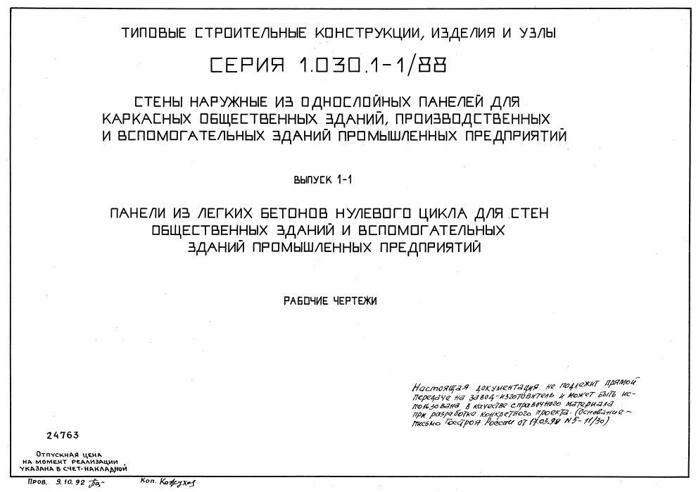 Серия 1.030.1-1/88. Стены наружные из однослойных панелей для каркасных общественных зданий, производственных и вспомогательных зданий промышленных предприятий
