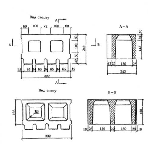 Камни для кладки стен КЛ-ПР-ПС 39,2. Унифицированные изделия, имеющие прямоугольную форму с рядом конструктивных особенностей в виде выступов, углублений и отверстий.