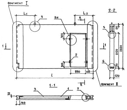 1,2,1,2 - индексы, характеризующие положение панелей в плане здания и их конструктивные особенности ( 1-панели поперечных стен или панели продольных стен, примыкающих к торцу здания; 2 - панель с проемом, 1 - ширина проема 890 мм; 2 - ширина меньшего простенка 450 мм).