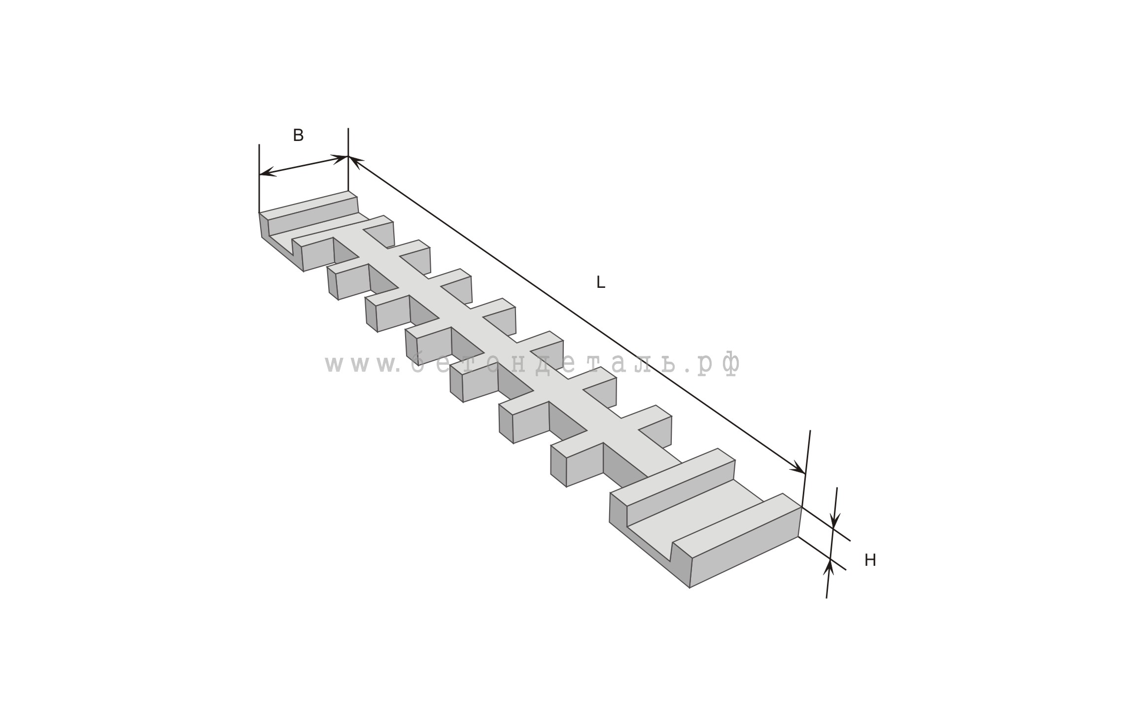 Шпалолежни ШЛ 1 – это железобетонные изделия, которые представляют собой монолитную балку, поперек которой расположены балочки длиной 1300 мм.  На верхней плоскости шпалолежня находятся закладные детали для крепления к рельсам.